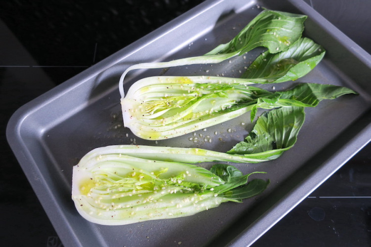 - roast the pak choi for 8-9 mins, watching carefully to ensure that the leaves don't burn.