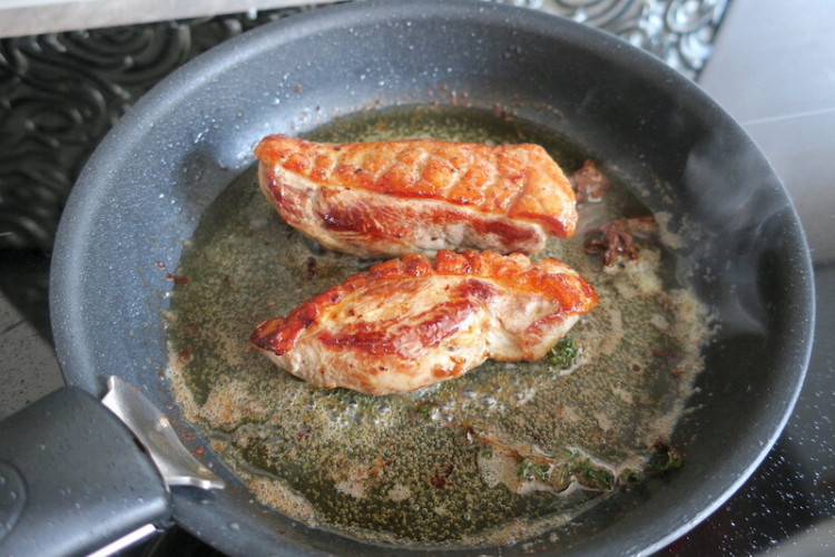 - turn the heat on to medium-high and pan-fry for about 6-8 mins - you may need to use tongs to hold the fillets on their sides if there is visible fat that needs rendering.