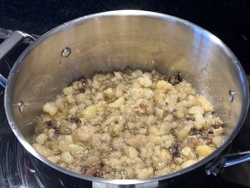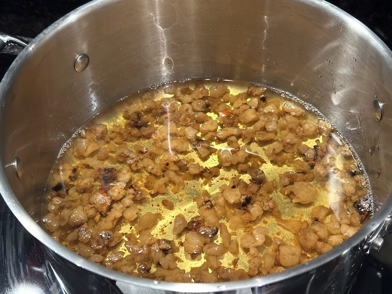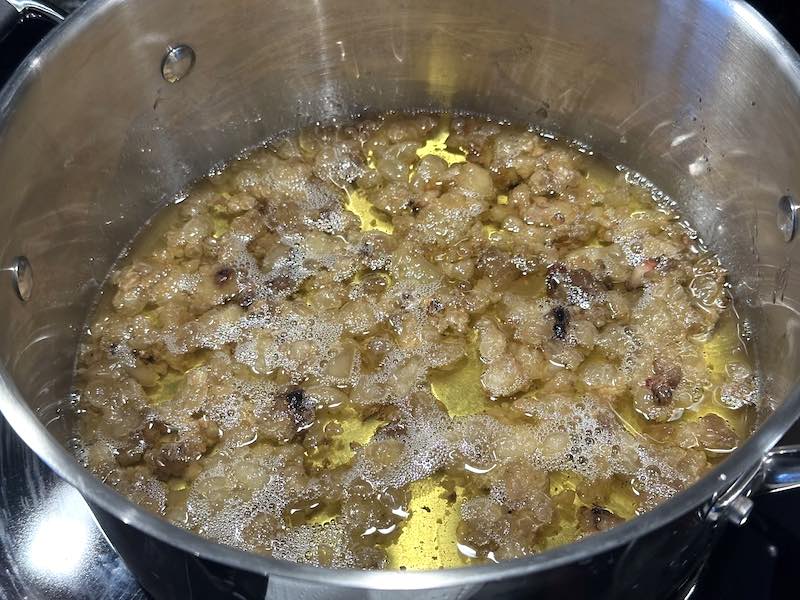 - stir initially, then let the fat liquefy for 1.5-3 hours, until the crackling sound has subsided and you’re left with a golden liquid and some crispy bits.