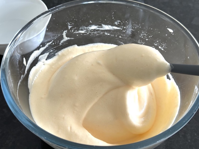 - weigh and mix remaining ingredients, tip them into the whipped yolks and promptly combine using the detached balloon whisk; the mixture will become dense very quickly.10 g egg white powder, 10 g whey protein isolate, 1/8 tsp xanthan gum