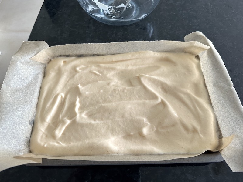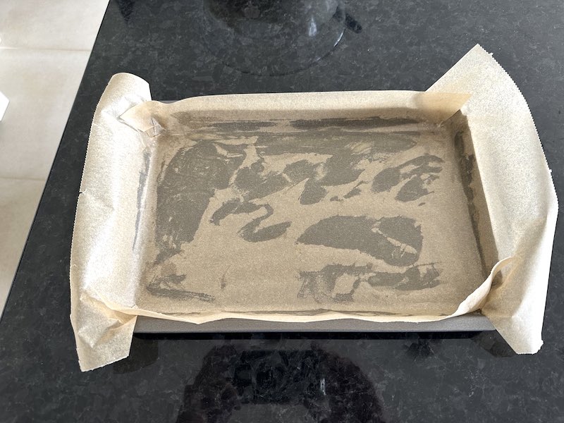 Prepare your baking tray/tin/pan. Make sure that the non-stick paper lining adheres to the tray bottom and sides (using a tiny bit of smeared butter), otherwise it will slide and you’ll have a mission trying to spread and level the batter.