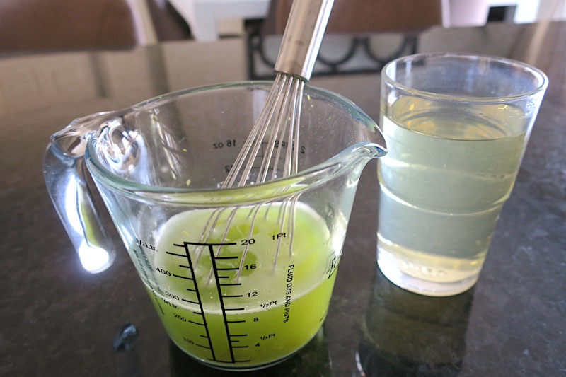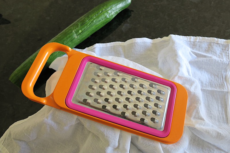 Shred the cucumber using a large-hole grater lined with a muslin cheese cloth, wrap the shreds and squeeze. Keep squeezing over and over until you obtain the correct quantity of juice. It is a bit of a hand work-out. But that’s the hardest part over.