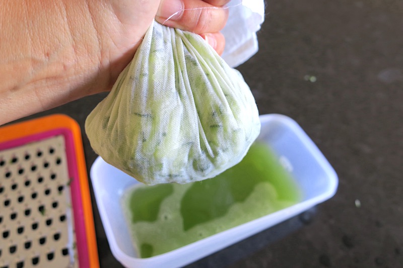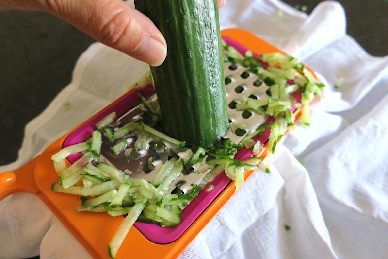 - alternatively, shred the cucumber using a manual shredder (large hole grater) lined with a muslin cloth, wrap the shreds and squeeze over and over until you've obtained the same quantity of juice (SEE STEP-BY-STEP PHOTOS IN BLOG POST ABOVE RECIPE)