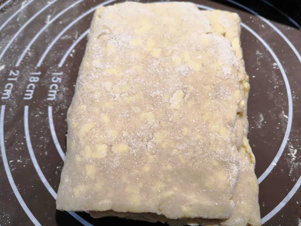 - dust a little more flour on the mat and both sides of dough and turn it 90° (quarter turn); repeat previous step.