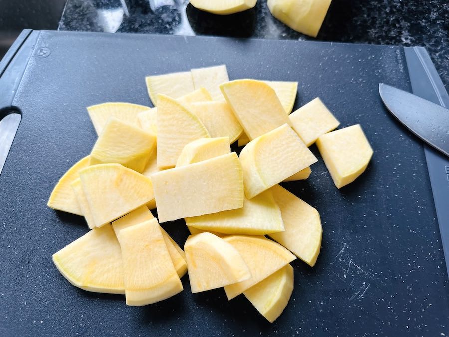 - whilst the meat cooks, cut the swede into large chunks, then slice each chunk as thinly as possible; plunge them into boiling water and cook for 10 minutes, then drain and set aside.250 g swede