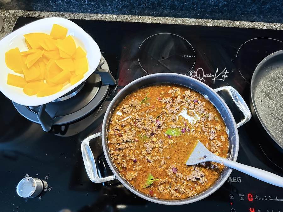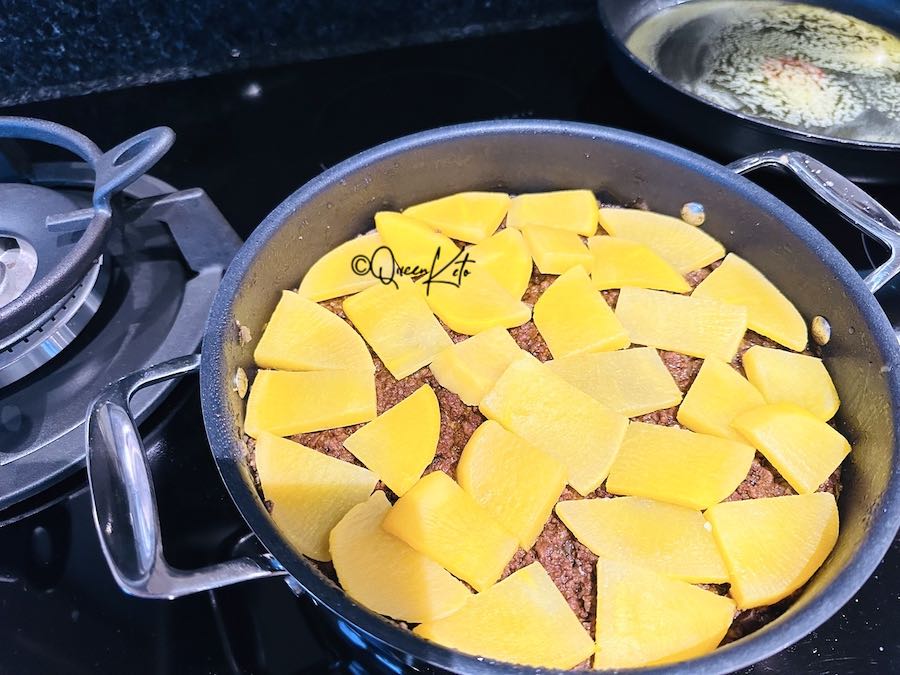 After chopping all your veggies very finely and softening them, you add them to the browned mince together with all herbs and spices and simmer gently for 2 hours. Meanwhile, you slice the swede and boil it for a few minutes. When the meat is cooked, you simply top it with the swede slices, pour crème fraîche and butter over it, and finish the dish in the oven.