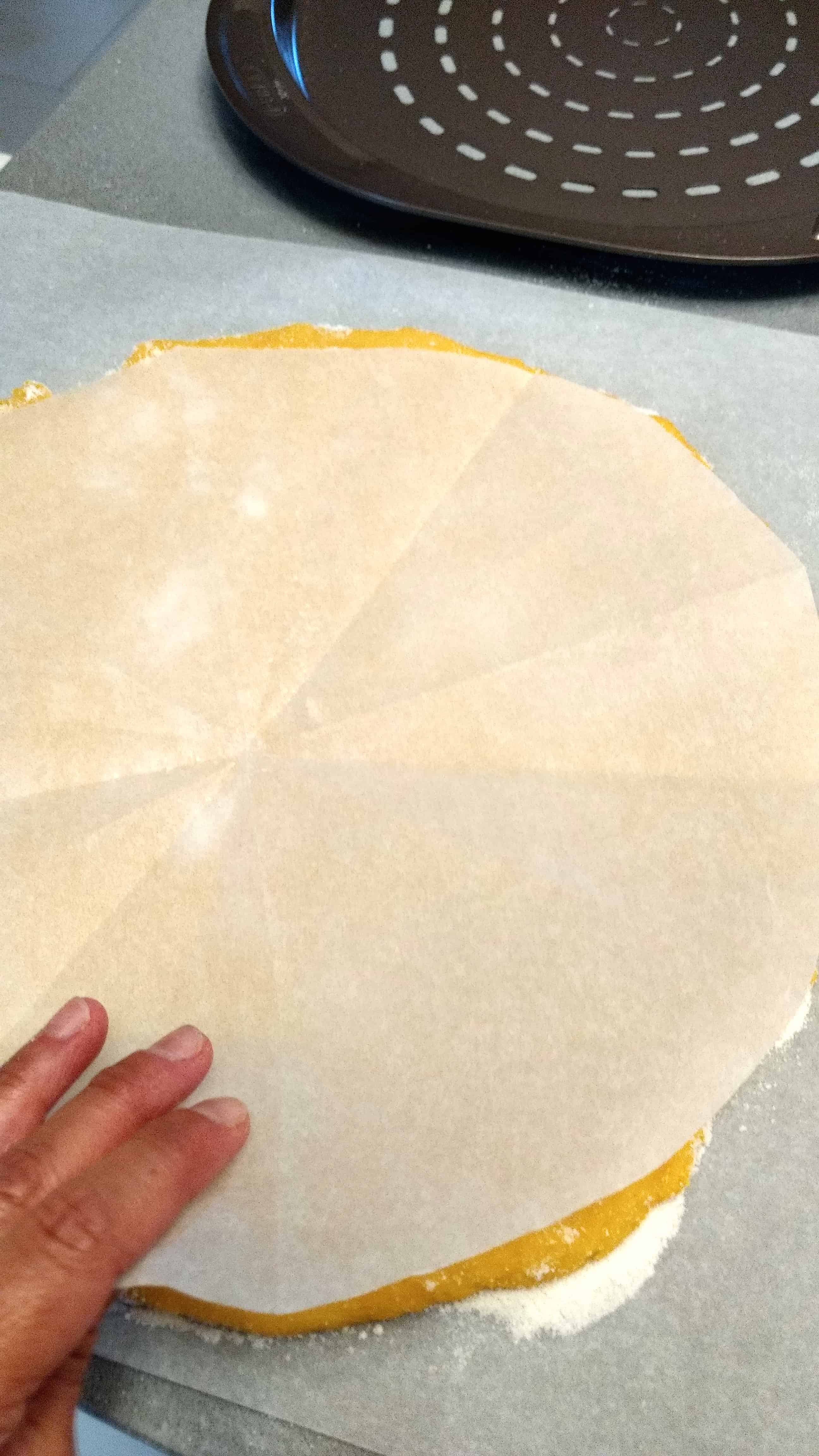 - place the dough over a sheet of parchment paper, flatten it a little with the palm of your hand, and start pressing it from the centre to the outer edge with flat finger tips and palms, as you rotate it; shape it according to your baking tray.