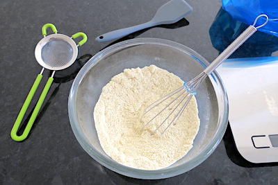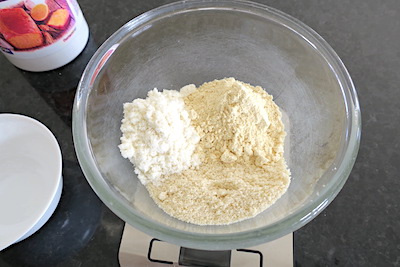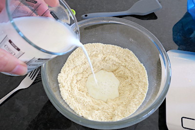 - sift dry ingredients and tip them into a medium/large mixing bowl, mix with a balloon whisk, make a well in the centre and pour in the milk.30 g whey protein isolate, 40 g lupin flour, 40 g ground almonds, ¼ tsp fine himalayan pink salt, 1 tsp xanthan gum, 1 tsp baking powder, ¼ tsp baking soda