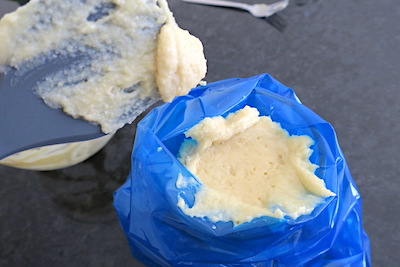 - transfer to a large sac-a-poche, cut the tip to create a 3cm opening and pipe around the outer sides of a LARGE 4-hole bagel/doughnut mould - or just pipe circles straight onto a silicone baking mat.