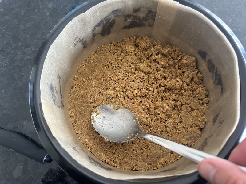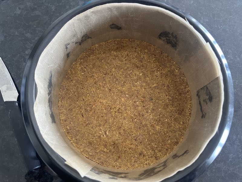 Ground pecans ready, you just need to mix them with lupin flour, sweetener, vanilla and butter. That’s it. Base layer ready. No need to bake it.