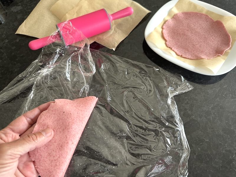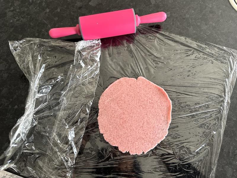 - lay out a sheet of cling film, place one piece of dough in the centre, and cover with another sheet of cling film.