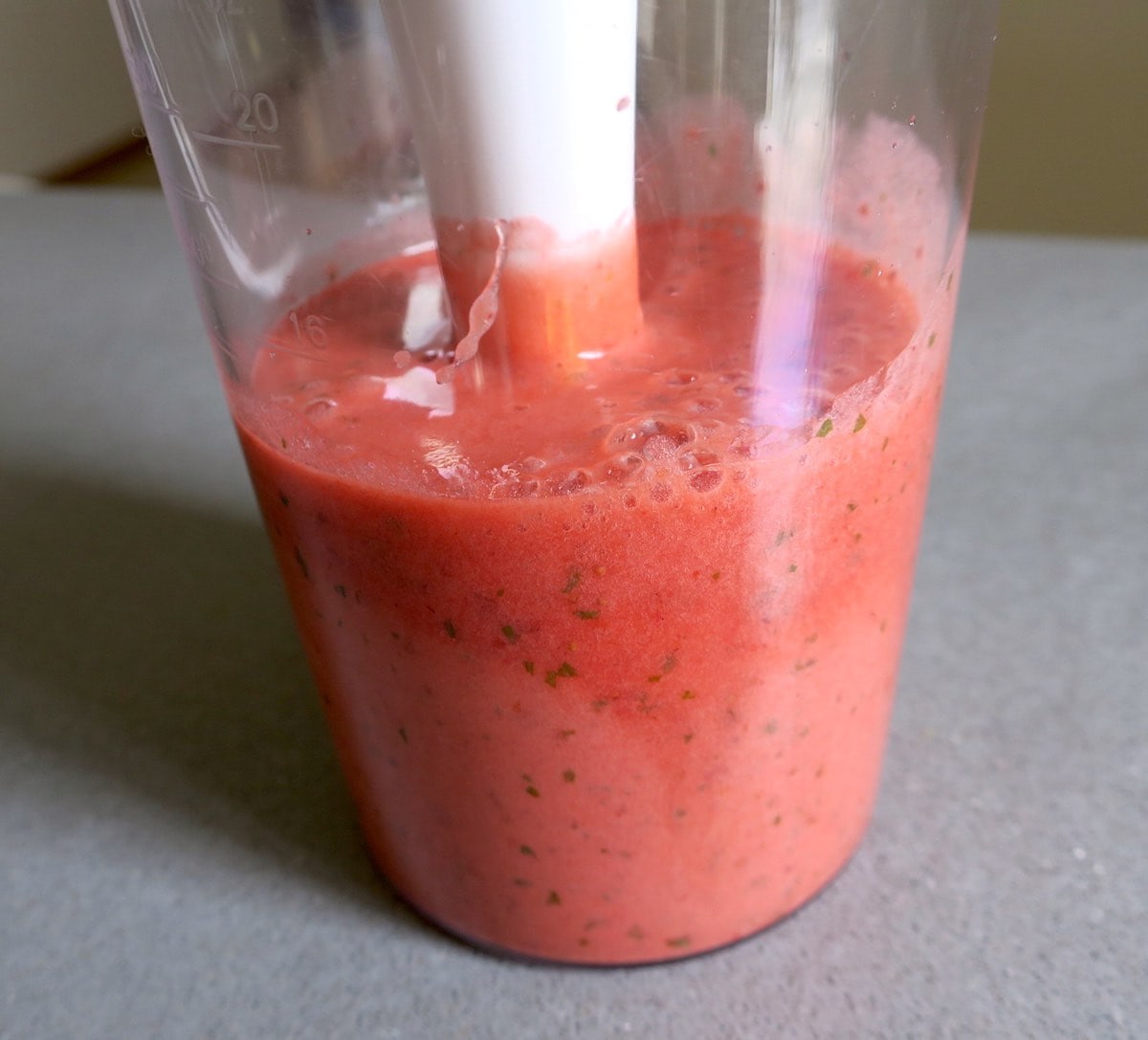- pour the mixture into a tall beaker and blitz using an immersion (stick) blender, with up/down motion until frothy, airy and smooth; leave aside to cool down completely, then transfer to the fridge while you continue with the recipe.