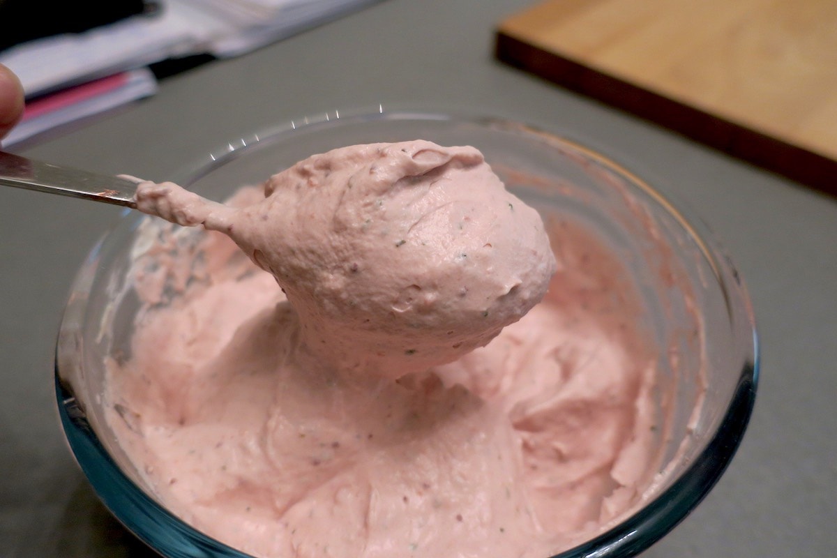 - once the strawberry gel is cold and firmer, loosen it with a fork, then gently combine it it with the whipped mascarpone cream to achieve a mousse-like consistency; keep chilled while you proceed with the sponge.