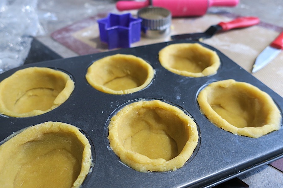 - knead the remaining dough and roll it out as before; cut 6 discs the same size as the base of your tray holes and insert them.