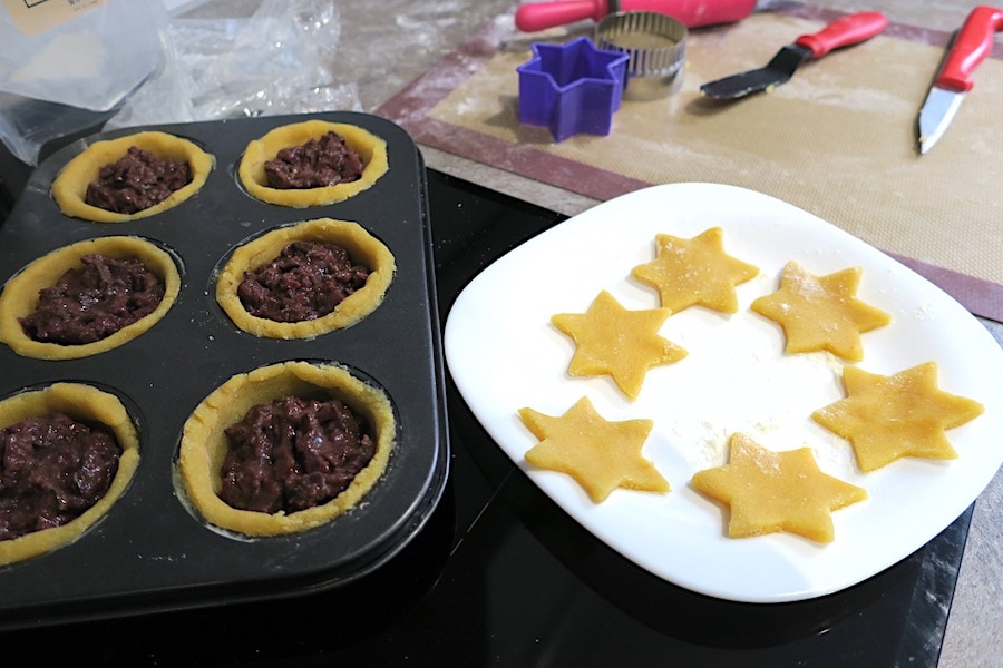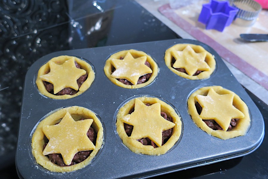 - scoop the mince meat into your dough-lined tray holes and place a star on top of each.