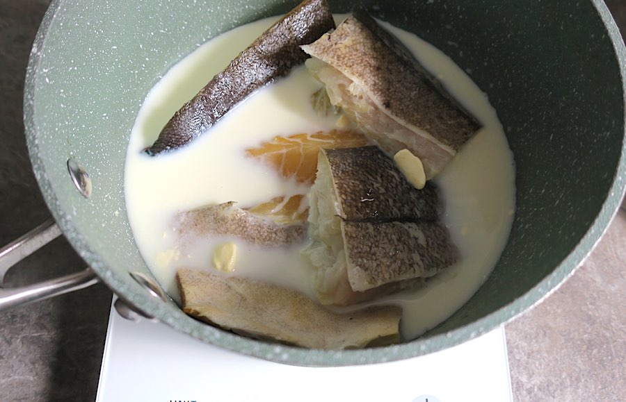 - place smoked haddock in a pan and cover with milk; bring to the boil and simmer for 3-4 minutes, until the fish is just cooked; drain, discarding the milk, and set aside.