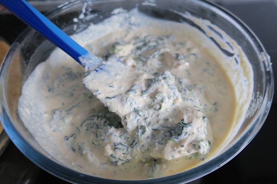 - roughly flake the fish and fold it gently into the ricotta mix with the chopped spinach.