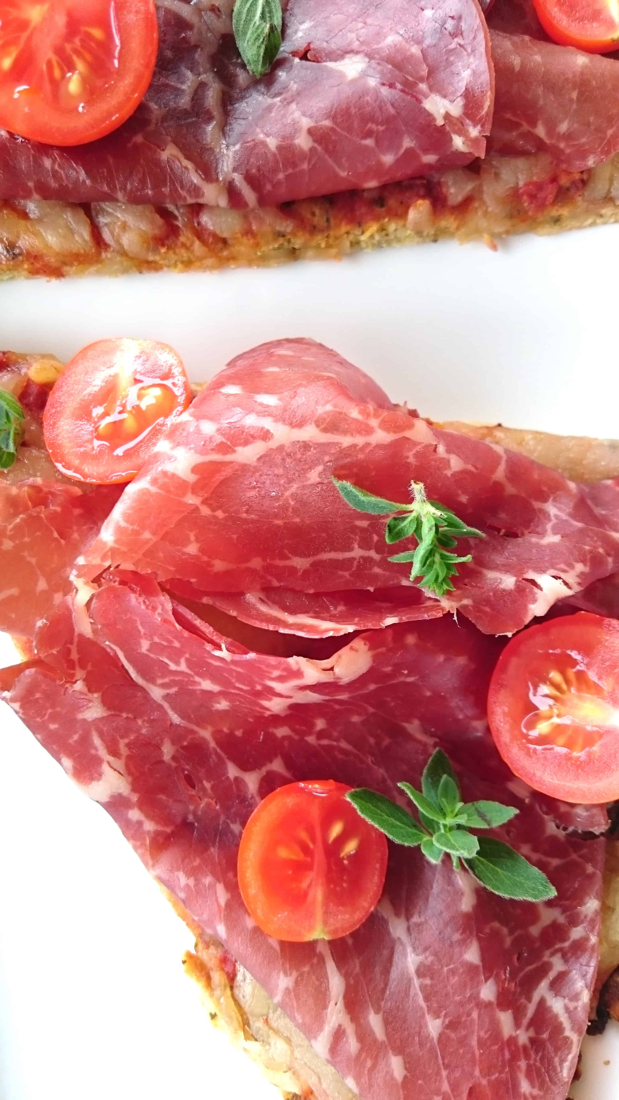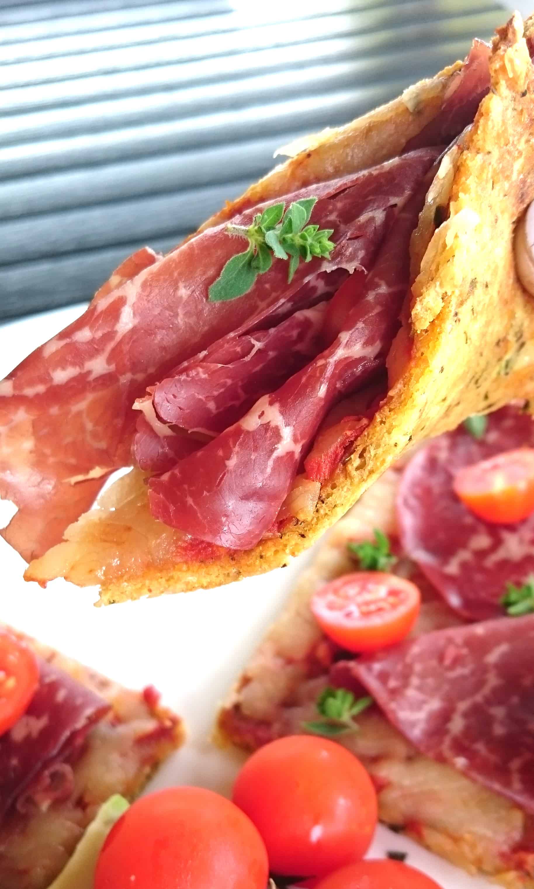 The macros in the recipe are for the pizza base alone. Adding tomato sauce, cheese and/or additional toppings will be extra. I topped mine with bresaola, cherry tomatoes and oregano leaves. Yum!