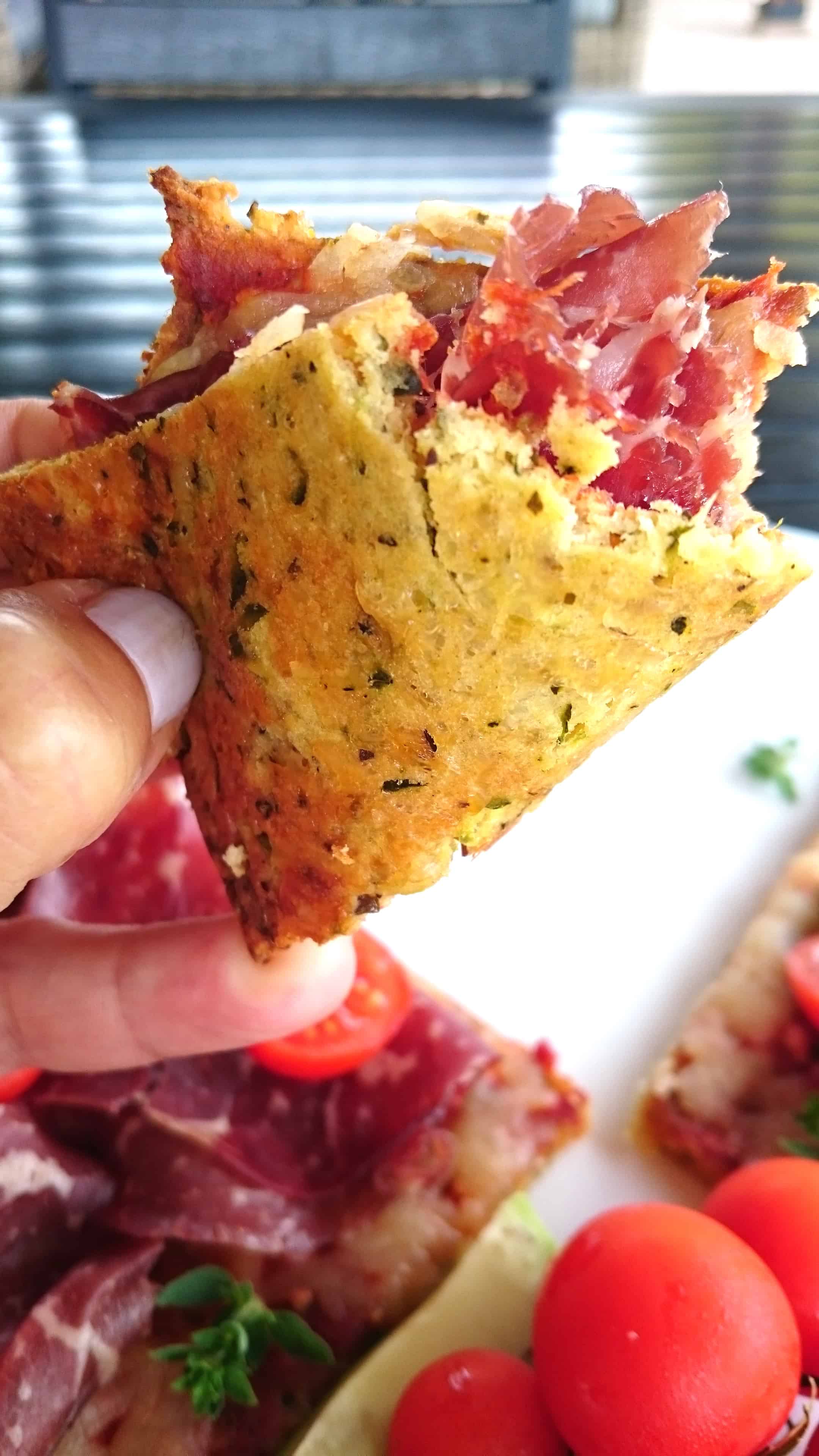 When I make the Zucchizza base in the UK, I use Emmental cheese because it’s lower in carbs than Mozzarella and makes it tastier, in my opinion. In Italy, the grated mozzarella I buy has zero carbs, so I use that.
