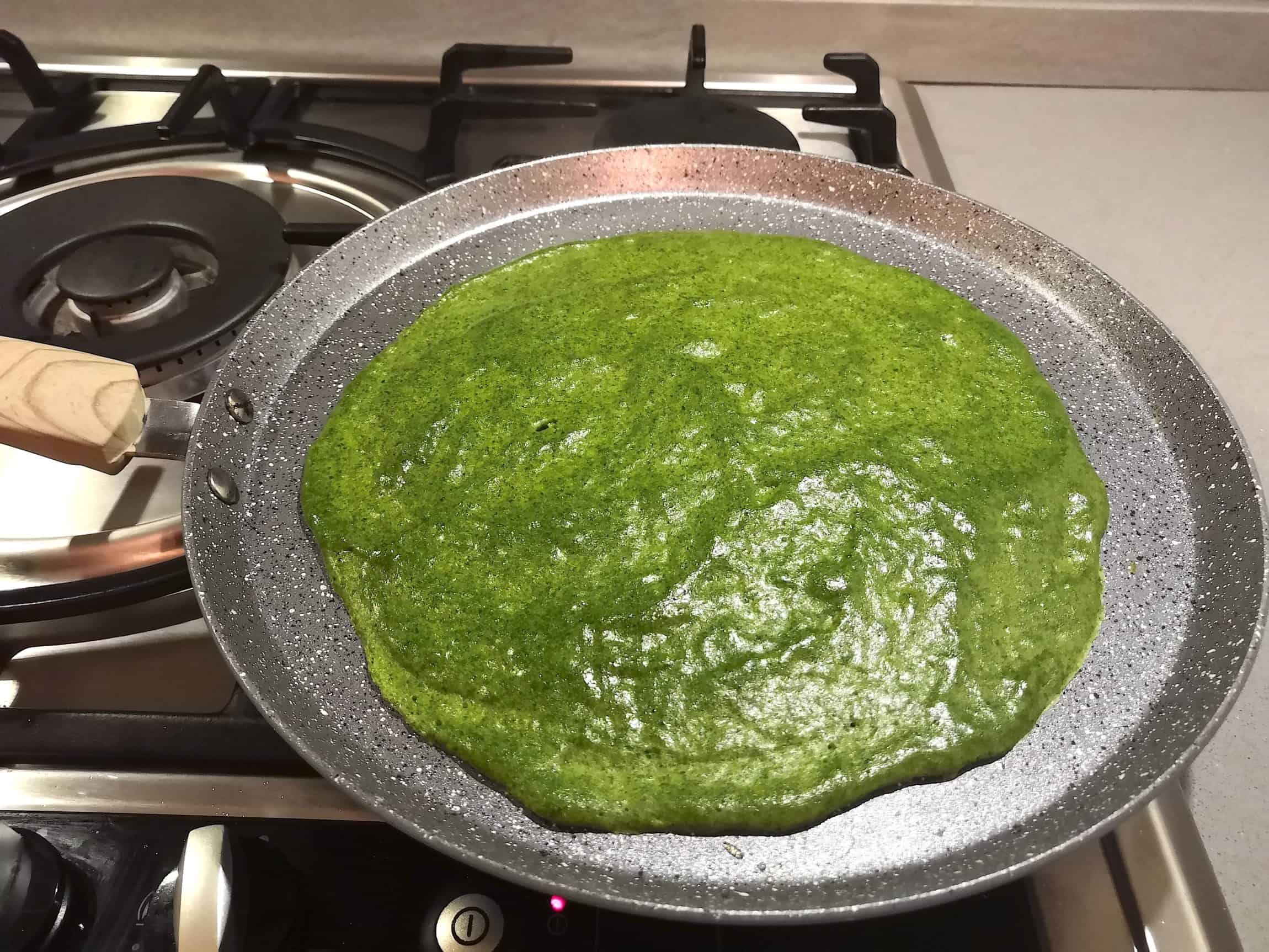 The funny thing is that these wraps were a complete fluke. I was planning on cooking myself an omelette for dinner and decided to add spinach to it, to save me the bother of cooking a side of veggies. But once I defrosted the spinach, I realised it was quite coarse and full of fibrous stalks, so I blitzed it before adding it to my egg. For added good fibre, I always put a bit of psyllium in my ultra-thin omelettes, so in it went.