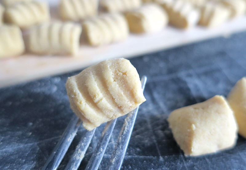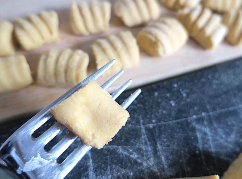 • (optional) one by one, press and slide the gnocchi unto a fork to create ridges (see post images).