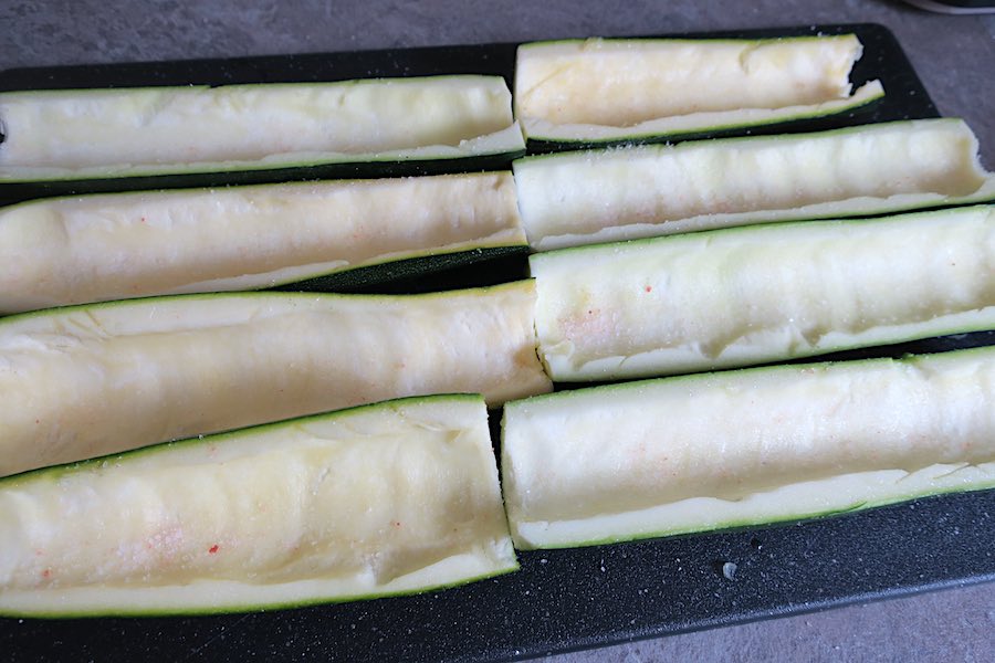 - turn your zucchini ‘boats’ over and wipe away all the released moisture with kitchen paper towels.