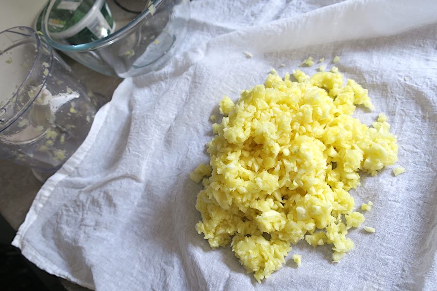 - blitz the pulp lightly using a food processor (I use a mini chopper - U.S. option HERE) in ‘pulse’ mode - to obtain coarse pieces; wrap the pulp in a muslin cloth and squeeze the water out (from 160g pulp, you should end up with about 110g).