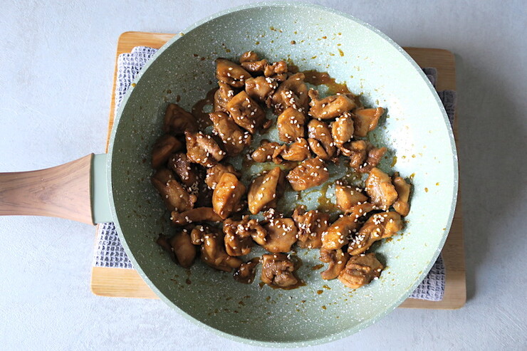 - while the chicken is cooking, toast sesame seeds until fragrant; stir half into the chicken at the end of cooking time.