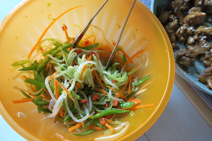 - slice mange tout lengthways, again creating thin strips.