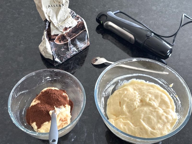 - transfer 1/4 of the batter to the empty yolks bowl and stir in cocoa.10 g Callebaut 100% cocoa powder