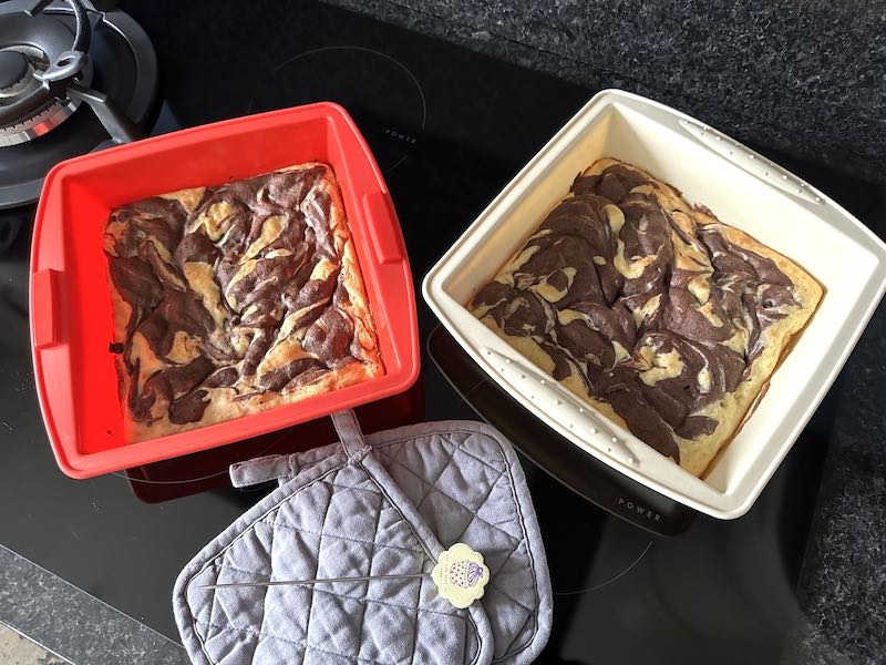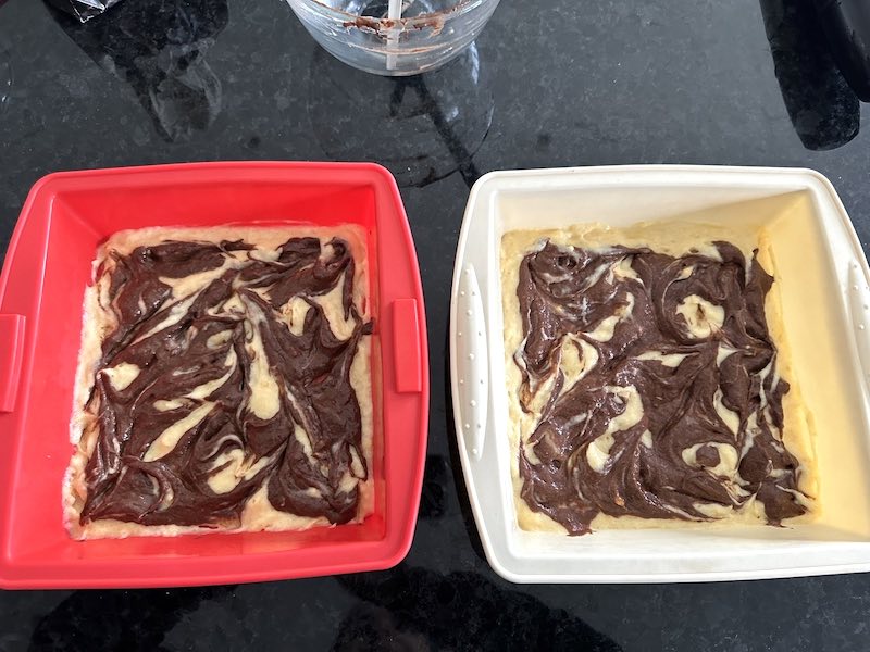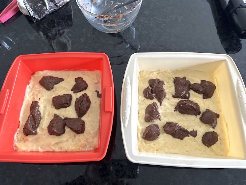 - add blobs of the dark batter then swirl with a spoon handle or wooden stick.