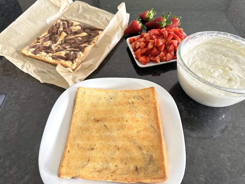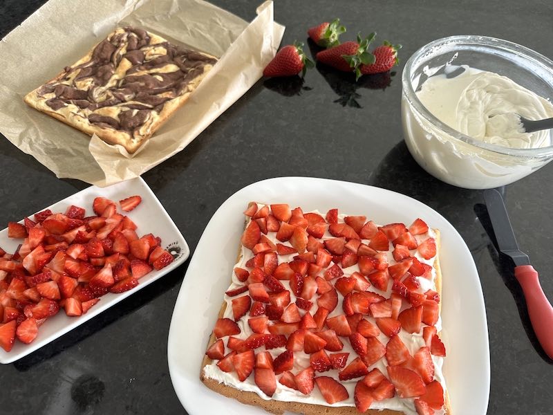 Assembly is easier than when making traditional Tiramisù. No need to dip biscuit fingers in coffee and arrange them. Instead, you lay one of the sponges upside down onto your serving dish, spread half the Ricotta cream over it, scatter half of the strawberry pieces, and repeat.
