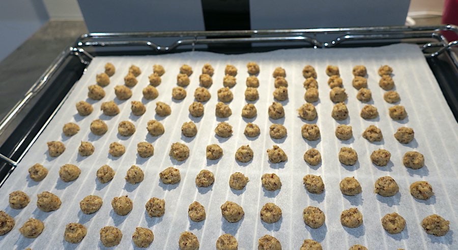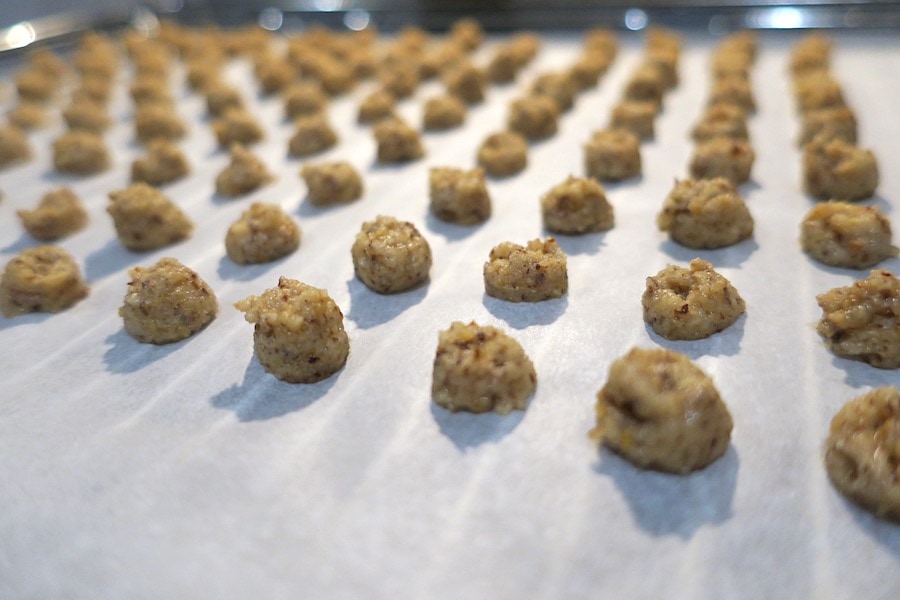 Once you’ve weighed and mixed sweetener with hazelnuts, all you have to do is whisk the albumen until peaks form. You don’t want stiff, dry powder peaks, so mind that you don’t over-whip. Combine everything. Spoon into a piping bag fitted with a round nozzle and drop tiny blobs onto a lined baking tray. Best to use parchment paper, rather than silicone, as it allows the Nocciolini to dry in a more uniform way.