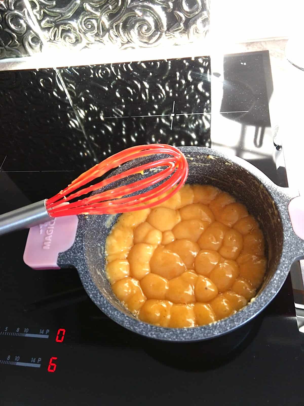 - stir with a hand whisk and bring to the boil, then turn heat down to a simmer (induction 6)