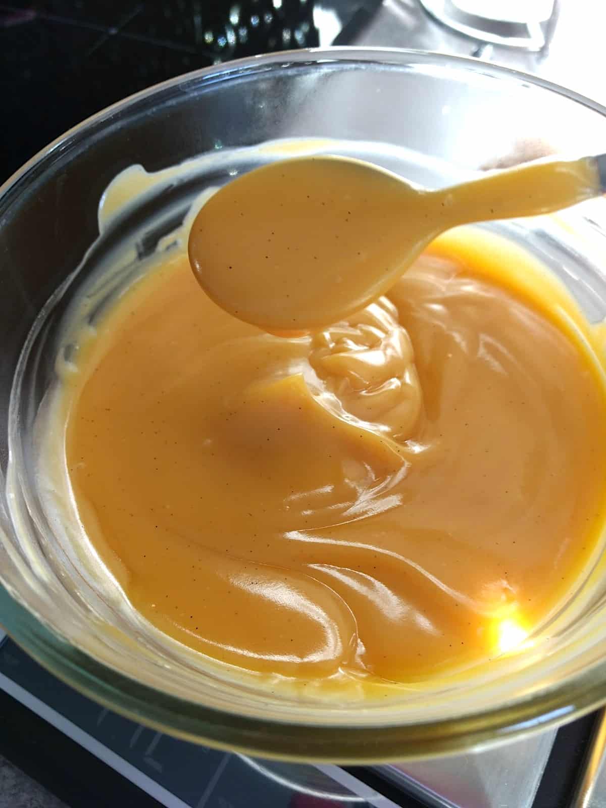 - the caramel will be ready when it is pale amber in colour and very thick, with a curdled look about it (see photo/video above); the mixture will have reduced considerably at this point.