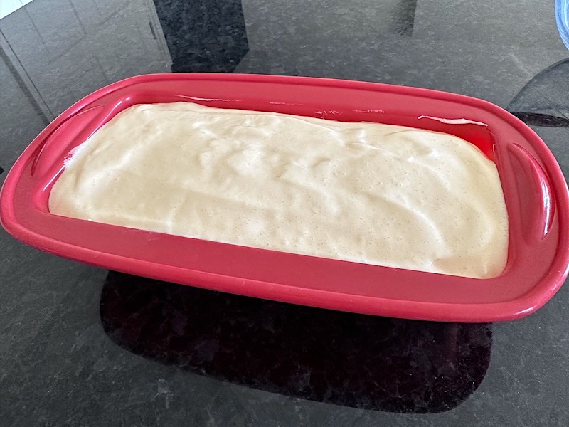 - pour 1/2 batter into a 2lb silicone loaf mould and bang the mould on the worktop to remove any air pockets; fill with the remaining 1/2 and level the top.