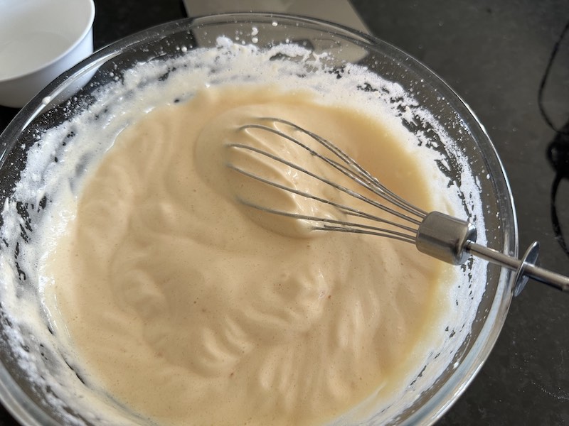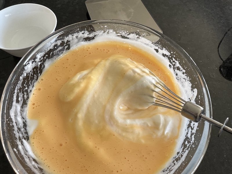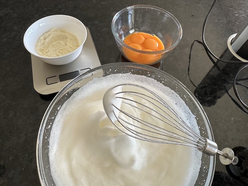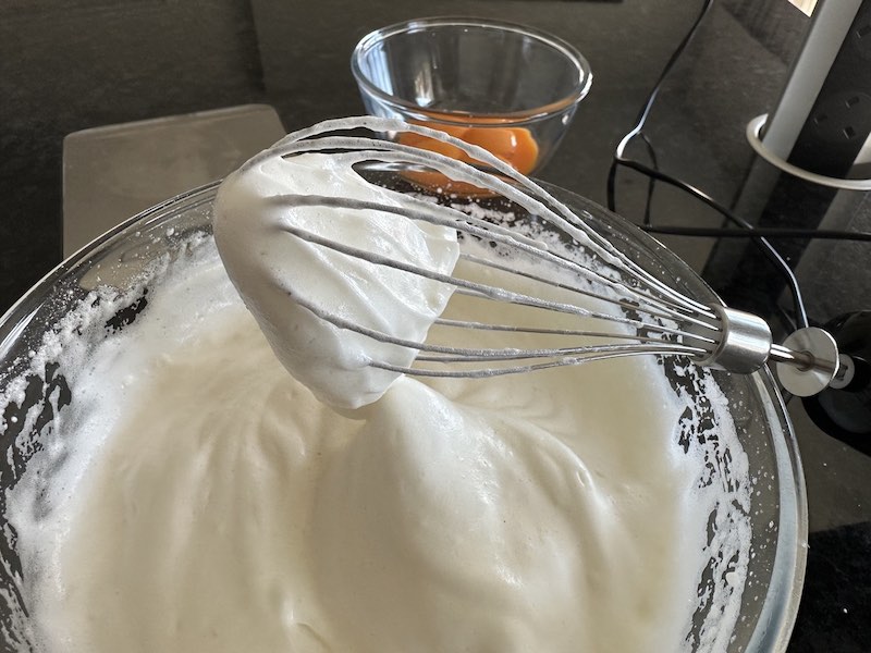 I recommend that you whisk beyond meringue stage – until you feel the blades resisting due to the density of the batter. Again, once you’ve added the dry ingredients and egg yolks, the stick whisk should slow down because the mixture is so thick. If you’re using a food processor, obviously you won’t ‘feel’ this resistance, so you’ll have to guess.