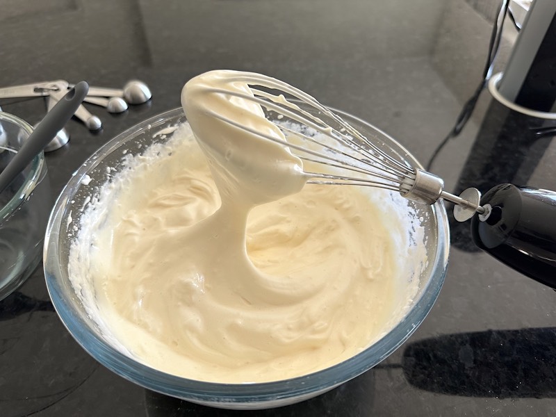 - use bare minimum speed on your electric whisk so the powder is incorporated, then whip on high speed until the mixture becomes dense and you feel resistance on the whisk blades; at this point, continue to whip for another 30 seconds.